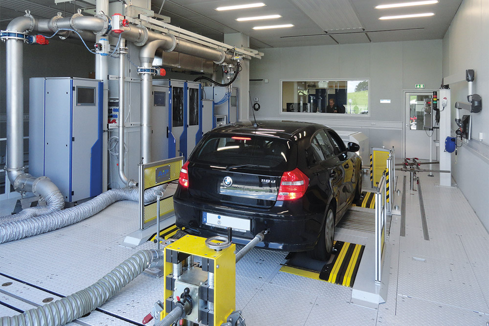 - An Rollenprüfstände in Verbindung mit einer EMS- Anlage zur Fahrzeugzertifizierung und Emissionsmessung