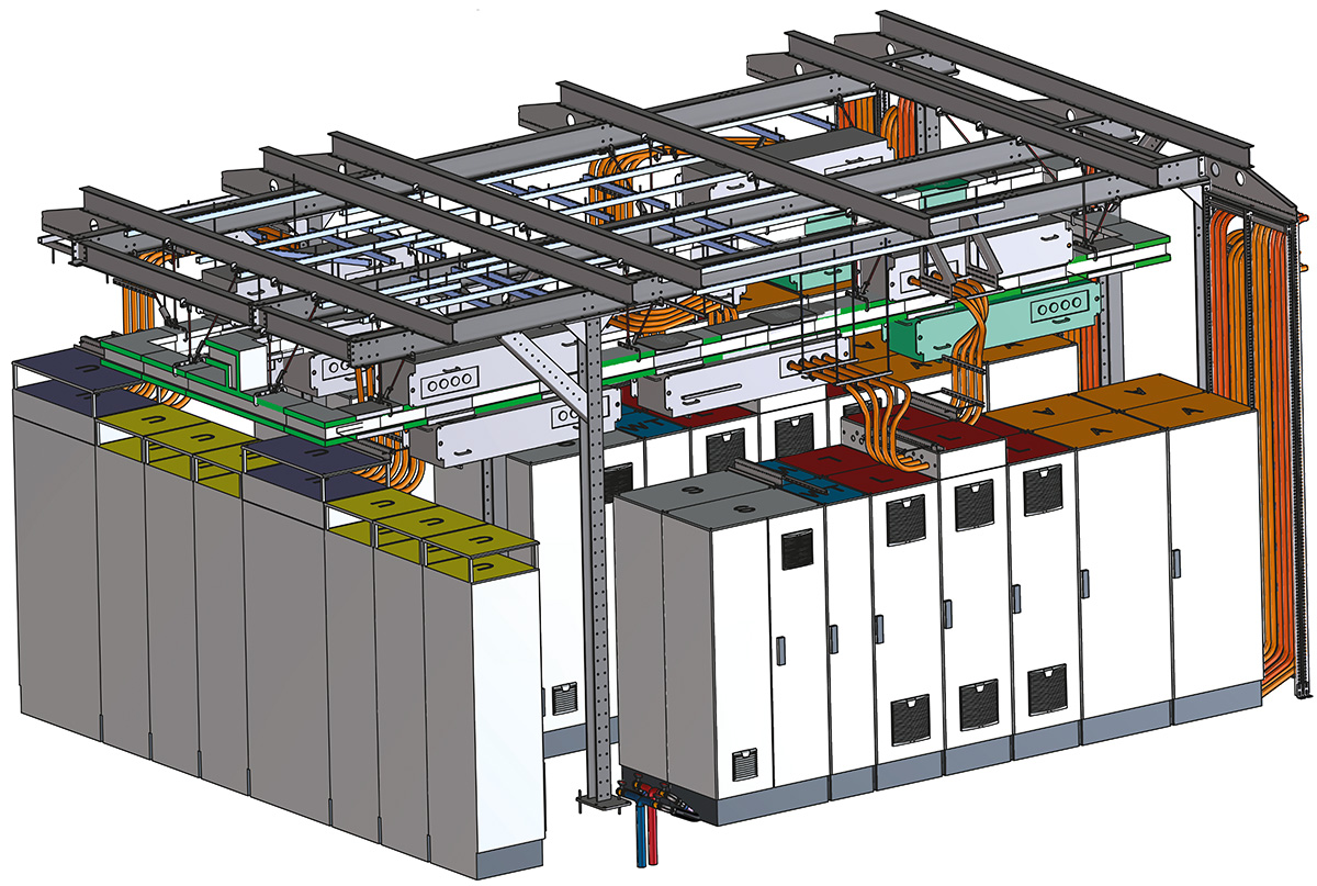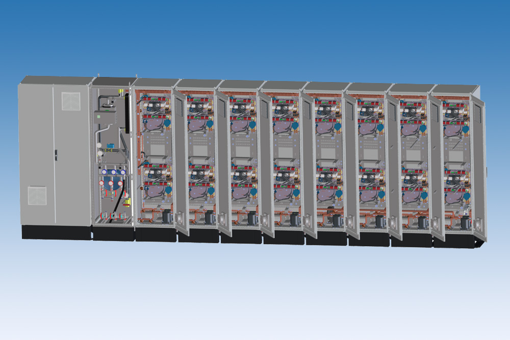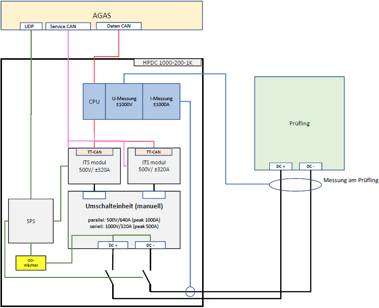 Der HPDC BattTest setzt sich aus einer Ein-/Rückspeiseeinheit, den Leistungsfeldern, einer Steuerungseinheit sowie einer Wärmetauschereinheit zusammen. Die Einspeiseeinheit dient der Bereitstellung der benötigten Versorgungsleistung für die Leistungsmodule. Ein Schaltschrankfeld ist mit 2 Leistungsmodulen à 100 kW ausgestattet.